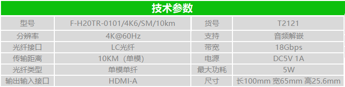 HDMI光纤延长器可将HDMI信号延长至10千米(单模光纤),视频分辨率达到4K@60Hz(YUV 4:4:4)。此产品支持双向红外控制即用户可以在信号源端控制显示端设备或在显示端控制信号源端设备,用户还可以使用RS-232接口,在发射器和接收器之间互传命令。发射器具有环路输出接口(共享本地高清影音)和音频插入功能,接收器具有音频剥离输出功能。